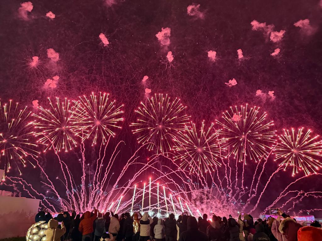 2025年12月31日晚,东谈主们来到上海国际邮轮旅游度假区不雅看烟花秀。新华社发