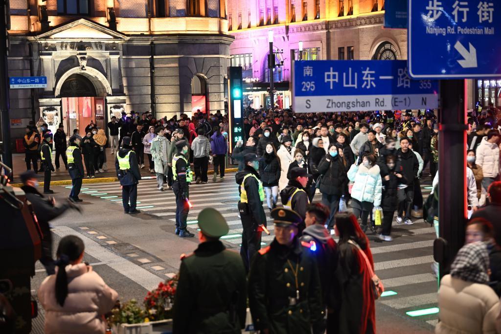 2025年12月31日晚,上海黄浦公安民警在外滩区域率领交通。新华社发