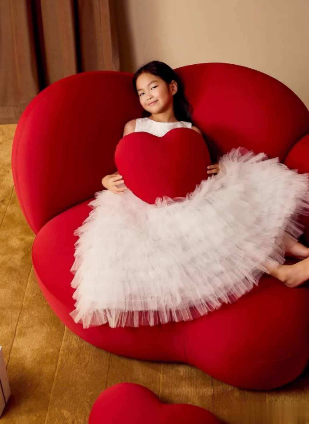 另外,值得一提的是,此次拍照的配景,阿谁红色的爱心沙发,依然朱丹男儿切身野心的,这样小就能野心出如斯顺眼的作品,真是是后劲无尽,太好坏了。