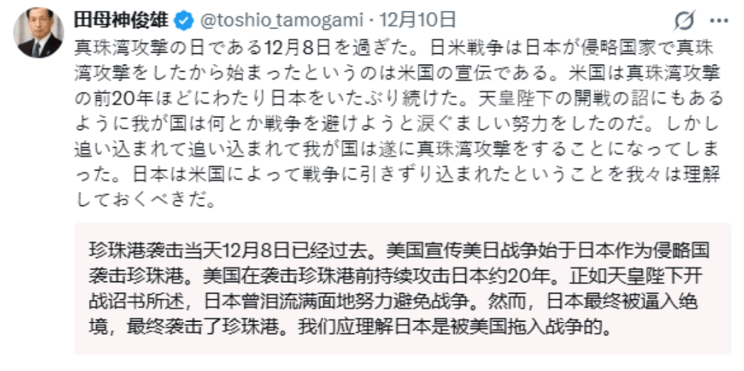 田母神的言论并不是巧合事件,而是日本右翼系统性否定历史骚动的延续。在他看来,珍珠港事件是日本被动承袭的自保反击,这一套逻辑齐备倒置了历史的真相,冷漠了日本在1931年占领中国东北、1937年全面侵华的事实。通过这种景观,日本右翼不仅企图将本人塑形成受害者,同期也在为不竭扩武备战寻找合理的借口。